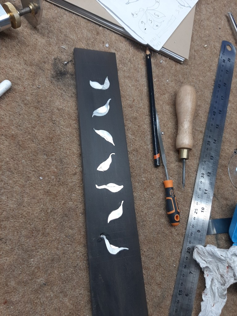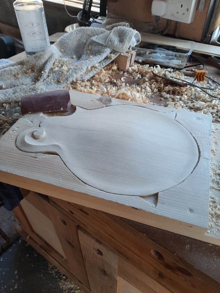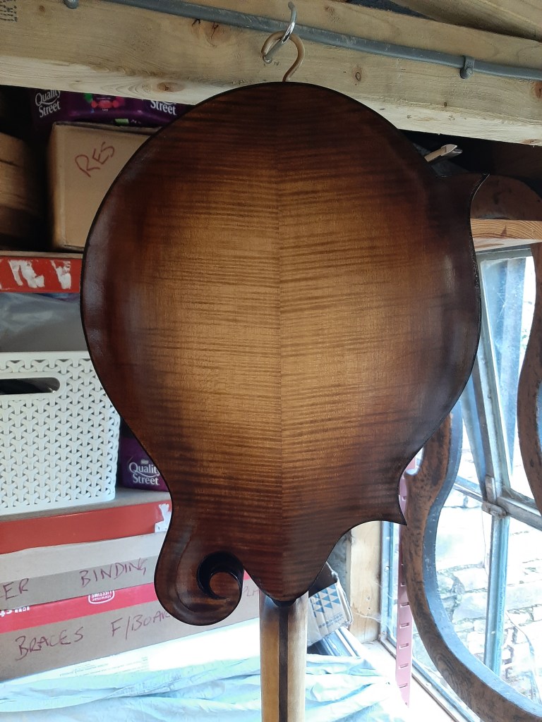 Carved by hand from book matched quartersawn spruce.Thicknesses based on Lloyd Loars plans before tuning.Inlay options are infinite, from traditional to contemporary.Trimming the binding during final sanding.Every piece of wood is individual and chosen for the specific instrument.Hand rubbed stain begins to reveal the depth of the flame.Each bridge is carved from scratch and fitted to the instrument.